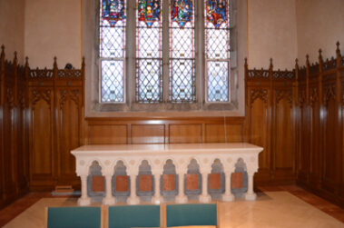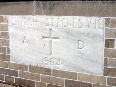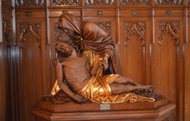 A baldachin is an ornamental structure that resembles a canopy which is placed over a person or place of honor or veneration. Originally, a baldachin was made of cloth, but over time baldachins have also been made of other material such as stone, wood, or bronze. One of the most significant baldachins is in St. Peter’s Basilica in Rome and sits over that Basilica’s main altar which in turn sits over the grave of St. Peter the Apostle. This baldachin was designed by Bernini and is made of bronze that has been formed to resemble fabric. St. Agnes’ baldachin is made of solid oak and is supported by columns that are eighteen feet high. On the front of the baldachin are renderings of the Evangelists with their symbols subtly beside them. In the center are two angels holding the host for us to consume, as St. John in Revelation 10 was told to take the Word of God and consume it. Beneath the host is the Holy Spirit. The spires on the top of the columns are replicas of original spires that had been in the Cathedral up until the early 1980’s and have been in storage since that time.
